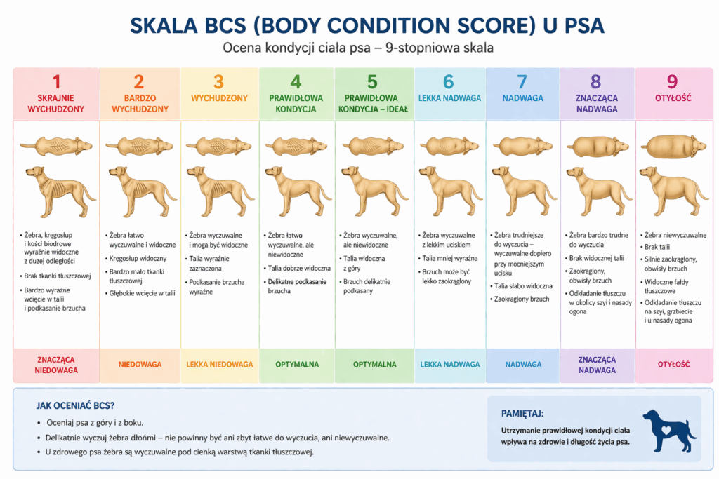 Najprostszą metodą oceny jest tzw. skala BCS (Body Condition Score). W domowych warunkach sprawdź dwie rzeczy:
